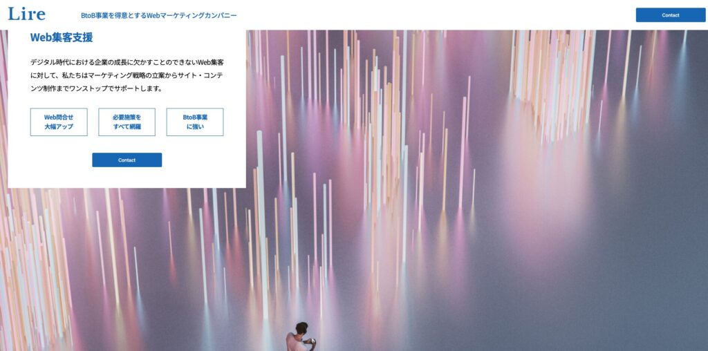 株式会社Lireが提供するWeb集客強化支援は、BtoB企業のWebからの問合せ獲得に特化したワンストップサービスです。「Webサイトからの問合せが少ない」「改善施策が多すぎて対応しきれない」「広告やSEOをやっても効果が出ない」といった課題を、戦略立案からサイト構築、SEO対策、広告運用まで一貫してサポートします。