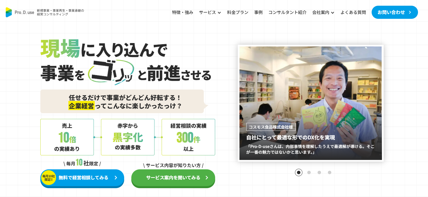 株式会社Pro-D-useは、大企業から中小企業、ベンチャー企業まで幅広く支援できる経営コンサルティング会社です。戦略立案だけでなく「実行・運用・推進」まで現場に入り込んで支援する実行型コンサルティングを強みとしています。得意領域は、新規事業コンサルティング事業承継コンサルティング製造業向けコンサルティング事業再生コンサルティングで、従業員マネジメントから営業同行、外部パートナー開拓など実行面まで踏み込んで支援します。